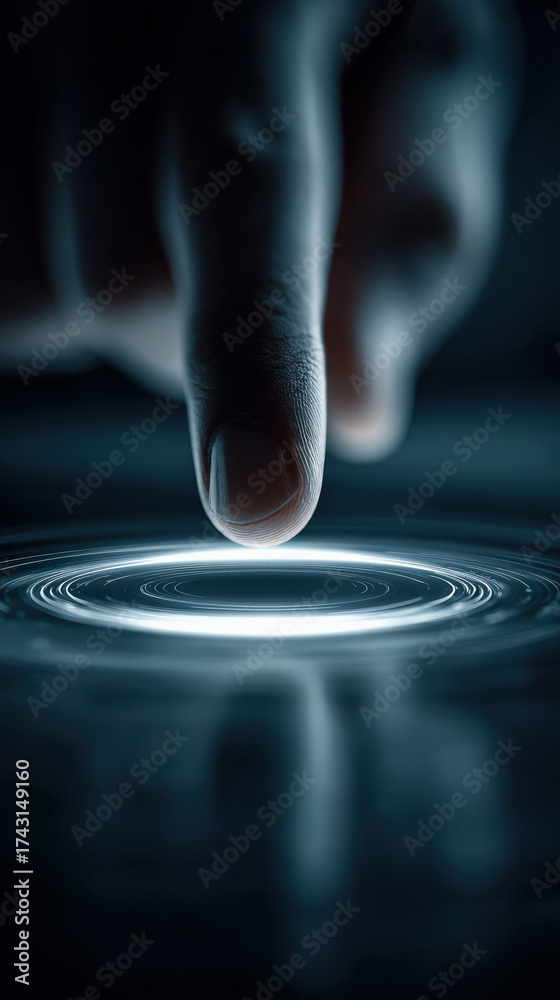 Futuristic touch screen finger technology interface neon glow circle ripple macro vertical frame human hand device gesture tap press haptic setup #1743149160
