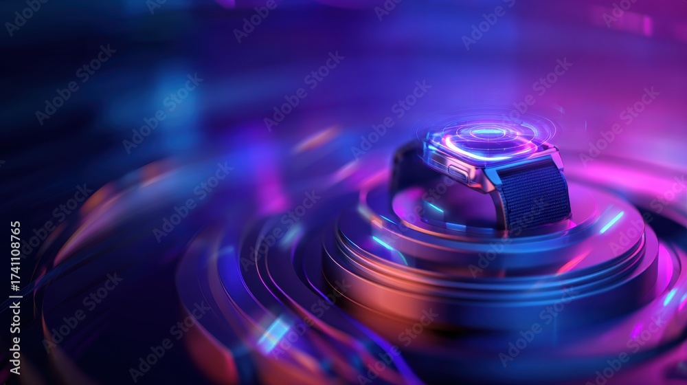 Futuristic wristwatch displayed in a vibrant, swirling neon environment with dynamic lighting effects #1741108765