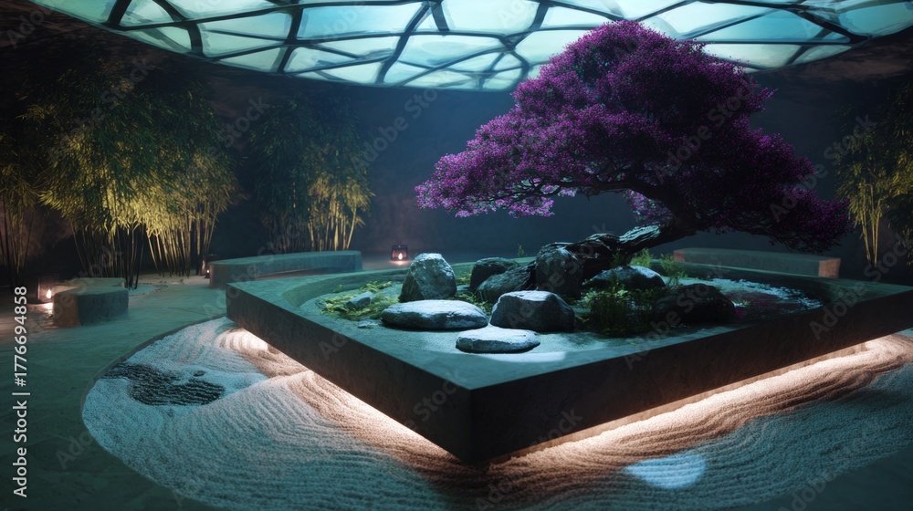 Futuristic zen garden within a virtual reality dome a tranquil digital oasis experience #1776694858