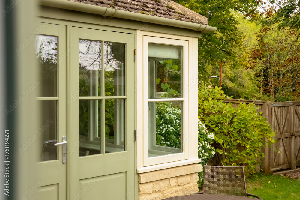 Garden room exterior with pale green door and window reflecting surrounding nature. Cotswolds countryside, England #1751194271