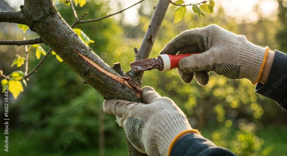 Gardener pruning tree branches with pruning shears in spring sunlight #1602384825