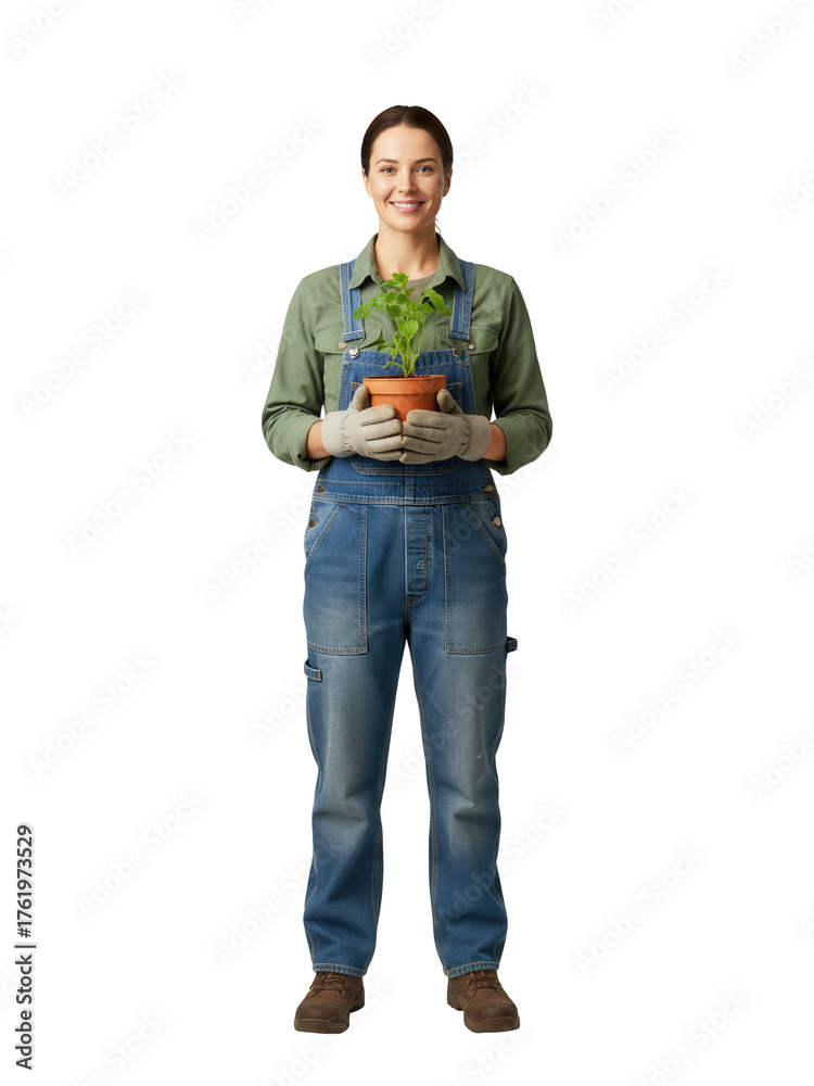Gardener woman holding a potted plant, isolated on a transparent background #1761973529