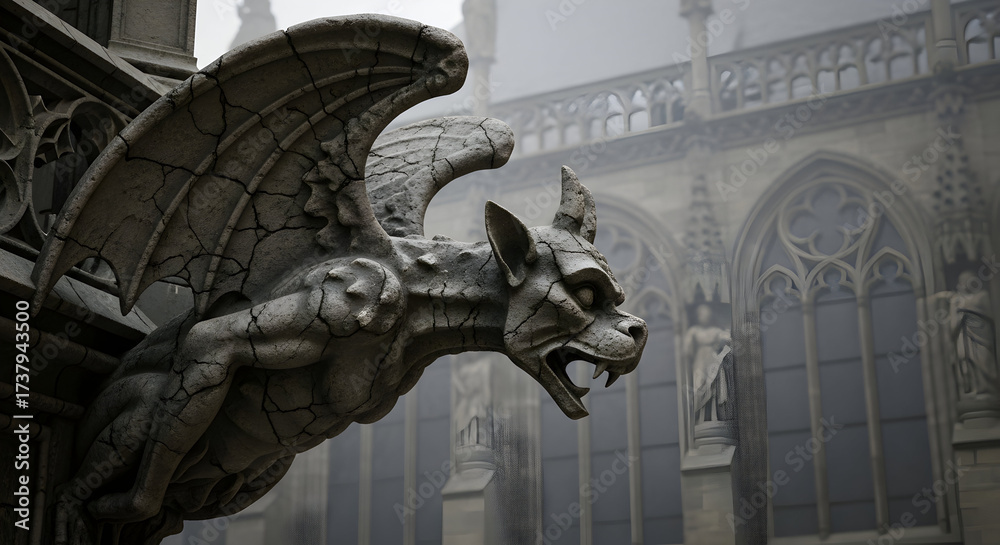 Gargoyle Guardian Ancient Stone Statue at Historical Cathedral Architecture Gothic Sculpture Parisian Landmark Mysterious Protector Religious Art Symbolism Europe City #1737943500