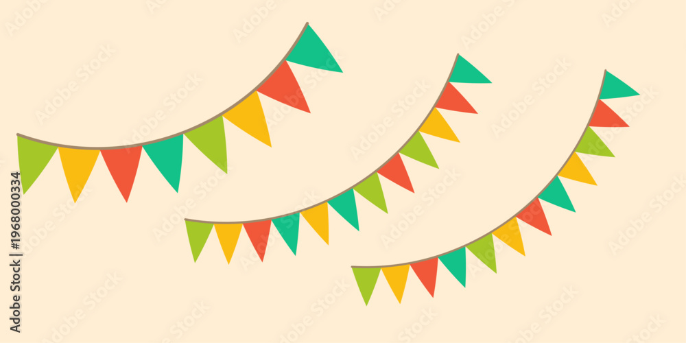 Garland colorful bunting flags on string for birthday party decoration, holiday anniversary fabric cute design, modern festive hanging decor. Isolated. Vector illustration #1968000334