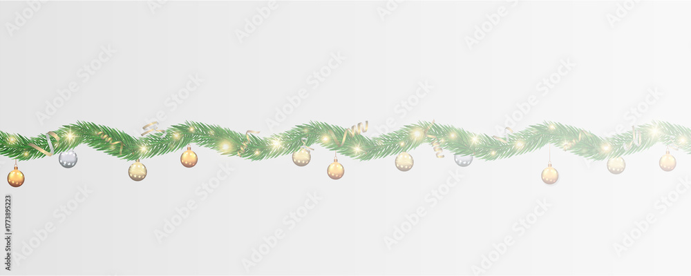 Garland of spruce branches. Christmas holiday decorations, realistic live fir tree effect with decorations for poster banners, png vector.Adobe Illustrator Artwork #1773895223