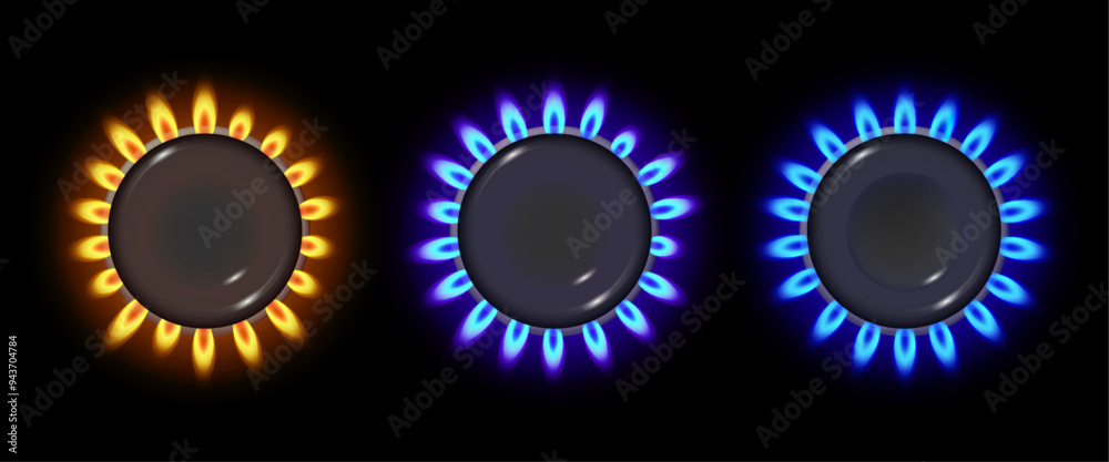 Gas burners top view, isolated set of realistic hobs with yellow and blue flames. Vector kitchen appliances for preparing meal and cooking at home. Economic technology for boiling and heat #943704784