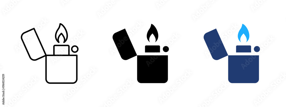 Gasoline lighter icon. Pocket lighter and ignition symbol. Flame, spark and fuel sign. Fire start concept representing gasoline lighter, refillable and flammable ignition tool. #1964534219