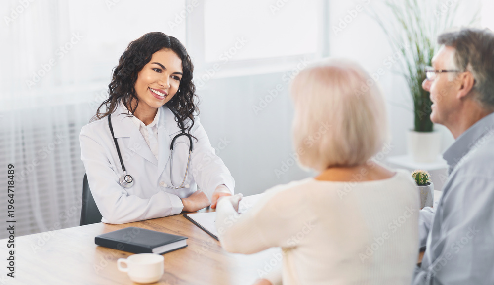 General Practitioner. Mexican woman physician and senior couple patients handshaking at doctor's office, copy space #1964718489