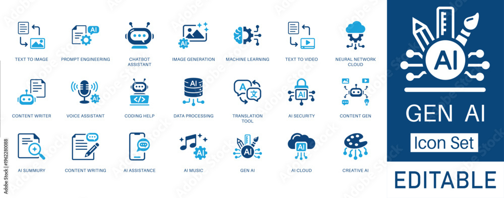 Generative AI and Creative AI solid icon set. Featuring prompt engineering, text to image, text to video, and content generation. Vector icons for tech startups and software projects. #1962280088