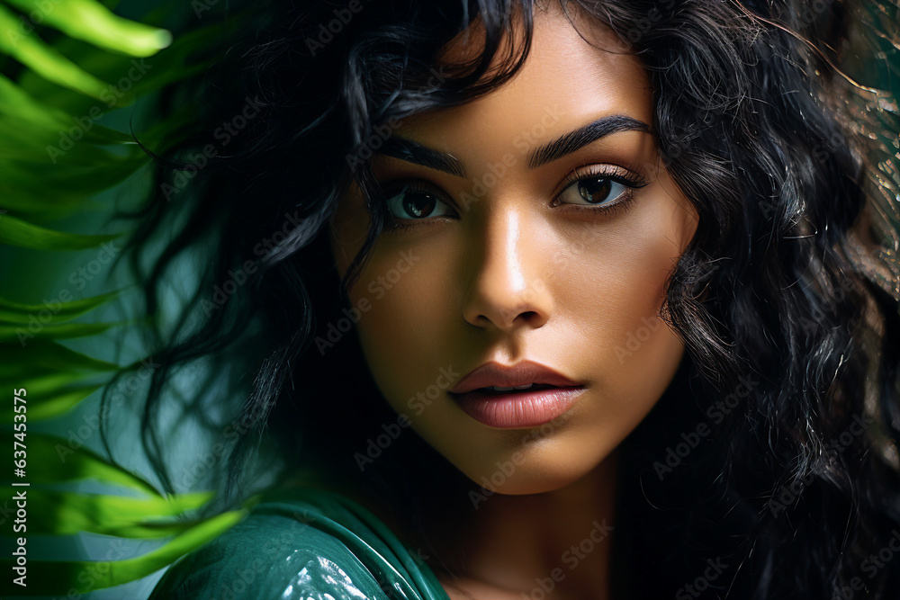 Generative AI picture of beautiful woman among tropical plants exotic palms in green jungle #637453575