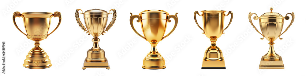 Generative AI, PNG set of 5 trophy cup. Champion trophy, shiny golden cup, sport award. Winner prize #624897961