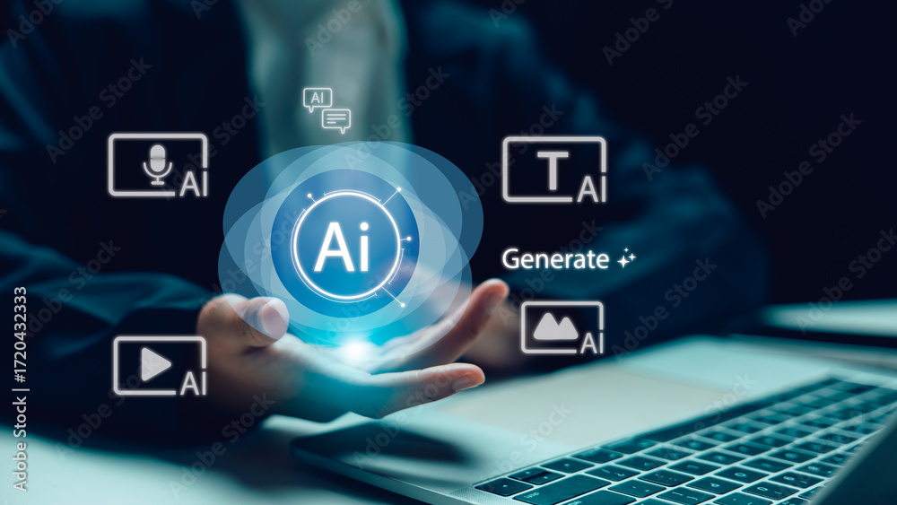 Generative AI technology concept with digital icons for text, image, video, and voice creation. Suitable for artificial intelligence tools, machine learning innovation, and creative automation. #1720432333