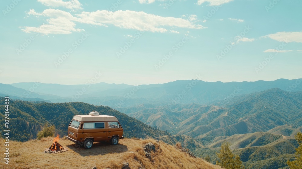 Generic unrecognizable camper van parked on a scenic hilltop overlooking vast mountain ranges, AI #1076144651