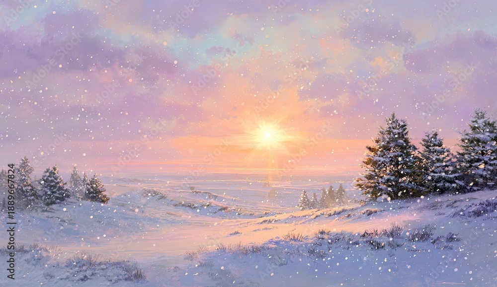 Gentle snowfall illuminates a tranquil winter landscape with warm sunset hues #1889667824