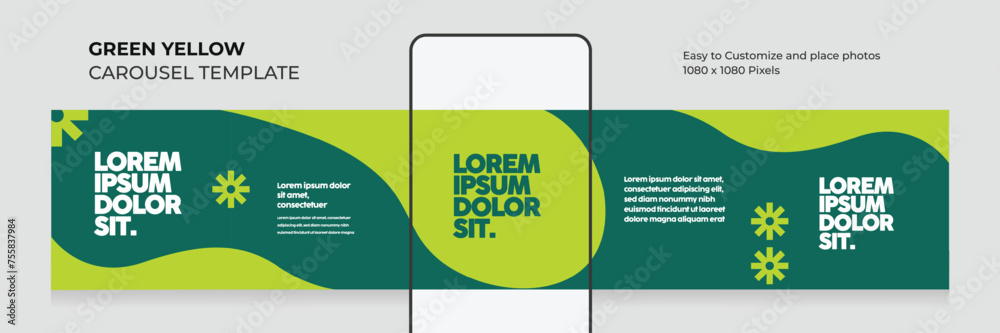Geometric carousel template. social media seamless square post. healthy. food. green. yellow. microblog. modern. clean. minimal. advertising. leaflet. brand. eps vector illustration #755837984