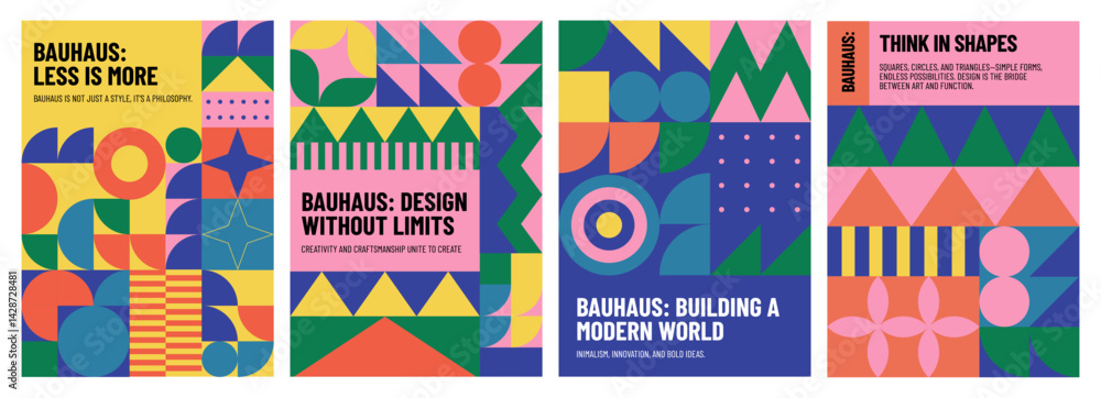 Geometric memphis poster. Abstract minimal bauhaus pattern with simple circle square geometric shapes, modern geometry Scandinavian cover design. Vector abstraction backgrounds set #1428728481