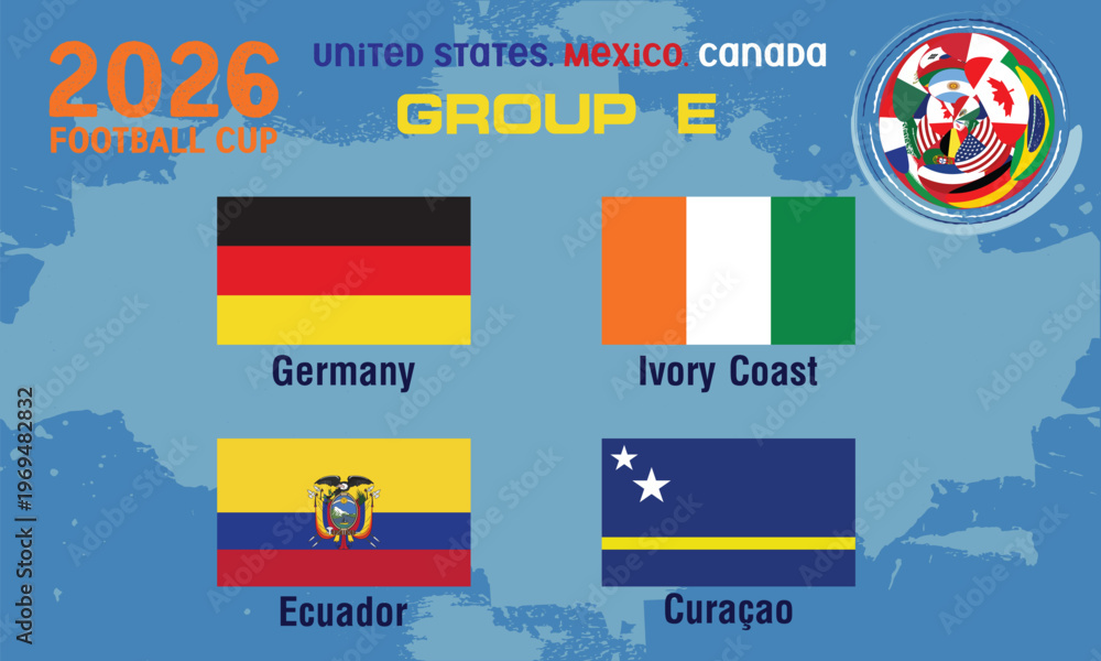 Germany,Ecuador,Ivory Coast,Curaçao, Countries and Flags soccer championship group E, 2026 football tournament group E. The 2026 football championship in the USA, Canada, and Mexico.eps #1969482832