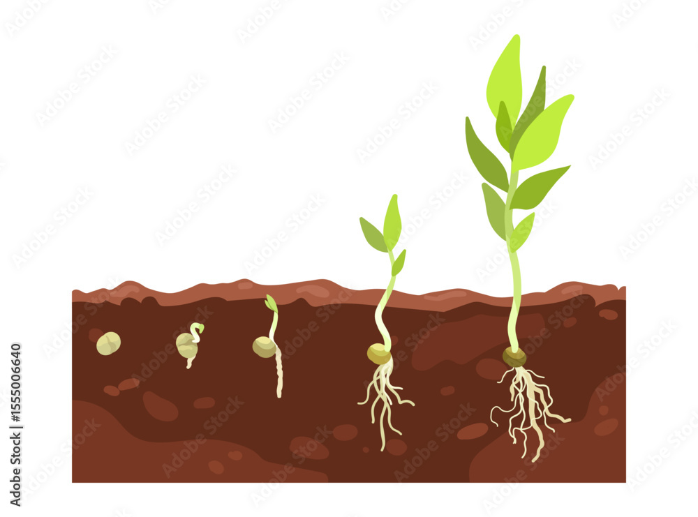 Germination seed, infographic hand drawn vector illustration of growing sprouts from grain, seed, stone to sprout and plant, roots and maturation are visible in soil, beginning flower growth stages #1555006640
