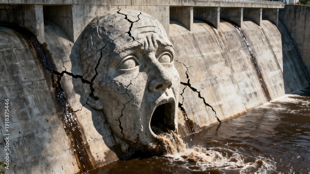 Giant cracked human head integrated into a dam with water gushing from its mouth #1918375446