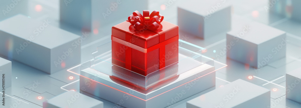 Gift Box in Digital Space: A vibrant, red gift box stands central amidst a network of digital cubes and connecting lines, symbolizing the essence of surprise, special offers, and digital giving. #1781817696
