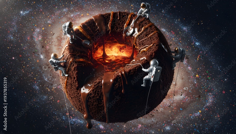 Gigantic chocolate fondant cake floating in deep space with astronauts mining lava center, sprinkles forming a vibrant galaxy nebula, surreal silliness concept. #1937855319