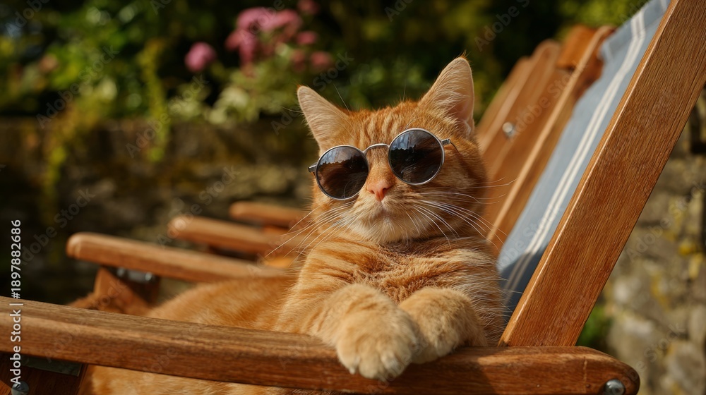 Ginger cat relaxing in deck chair wearing sunglasses #1897882686