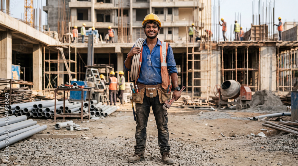 Giovane idraulico di origini indiane sorridente in un cantiere edile in India #1949306341