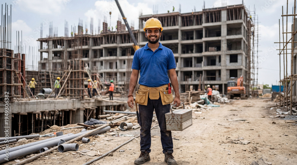 Giovane idraulico di origini indiane sorridente in un cantiere edile in India #1949306382