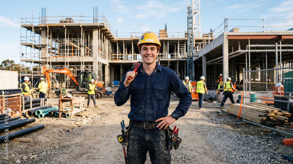Giovane idraulico sorridente in un cantiere edile #1949278892