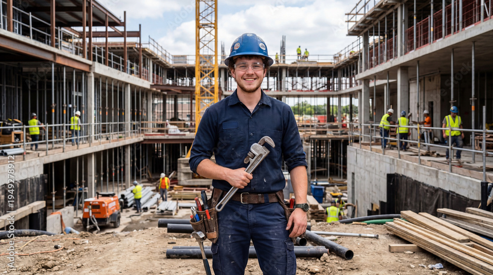 Giovane idraulico sorridente in un cantiere edile #1949278912