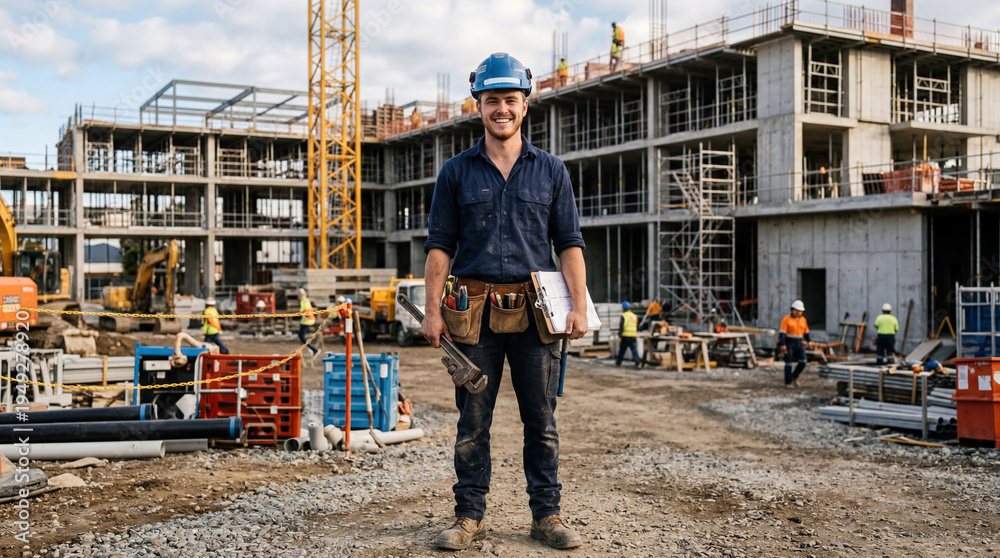 Giovane idraulico sorridente in un cantiere edile #1949278920