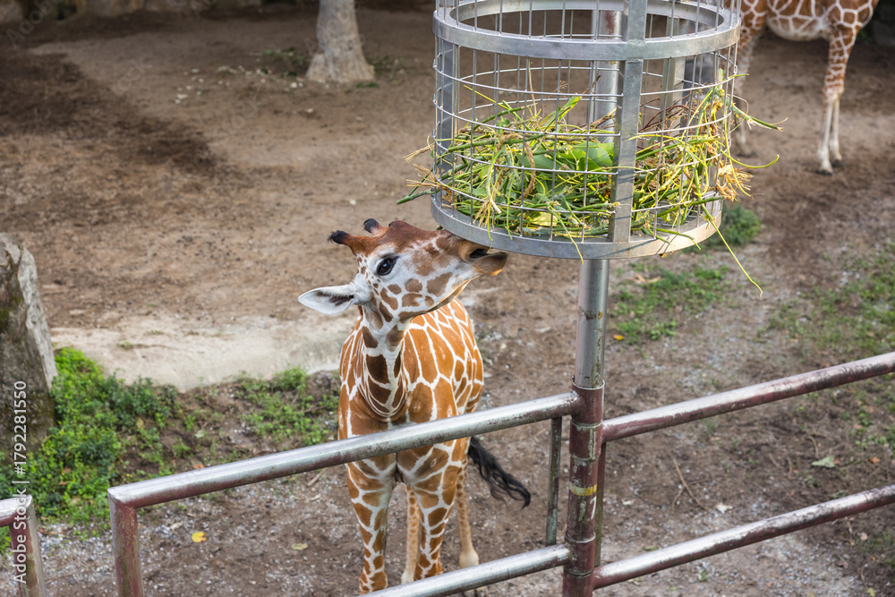 Giraffe eating leaves in zoo park enclosure #1792281550