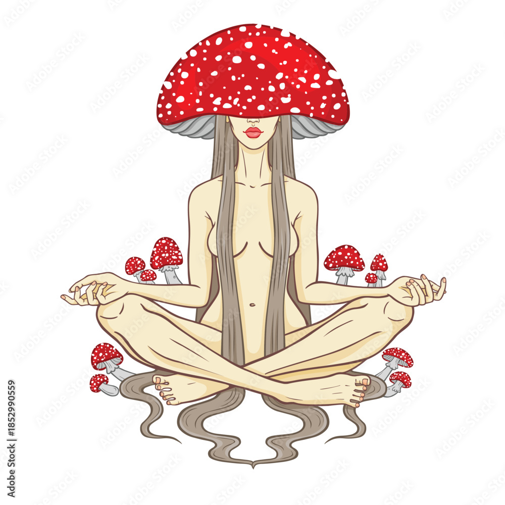 Girl in meditation with a fly agaric on her head. Vector illustration. #1852990559