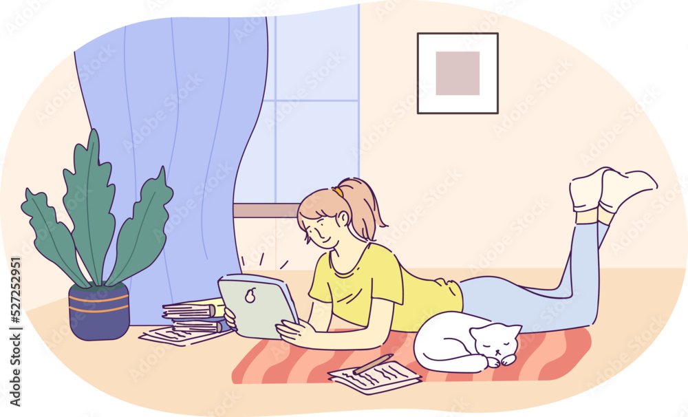 Girl lying on floor and working with tablet Pc. Girl student studying remotely using digital device and books. Schoolgirl learning lessons or doing homework at home hand drawn style vector #527252951