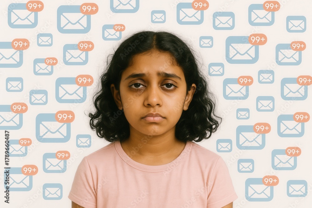 Girl surrounded by unread messages icons symbolizing information overload and digital burnout #1789660487