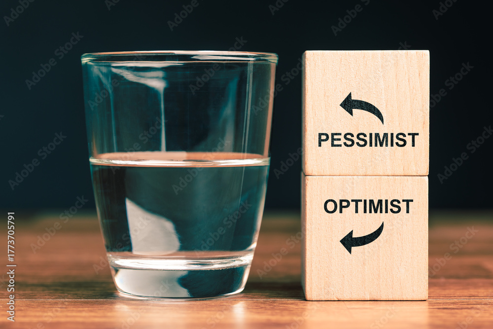 Glass of water with wooden blocks labeled optimist and pessimist symbolizing positive and negative mindset, attitude perspective, and psychological concept of optimism and pessimism #1773705791