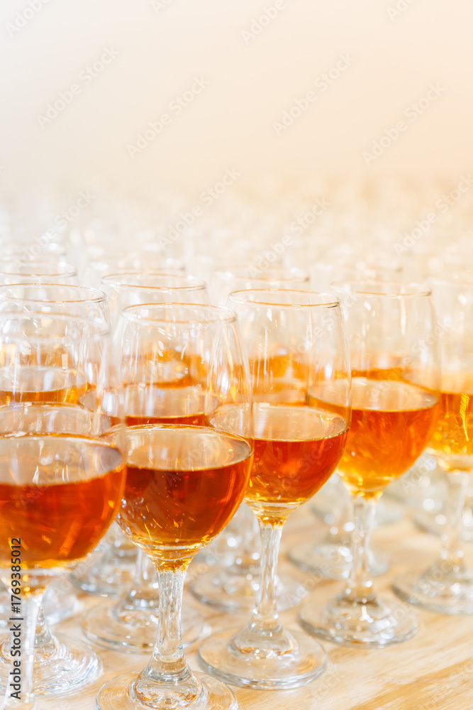 Glasses of Sparkling White Wine or Champagne on Table – Elegant Beverage Setup for Celebration, Wedding Reception or Event Catering with Golden Light Reflection #1769385012