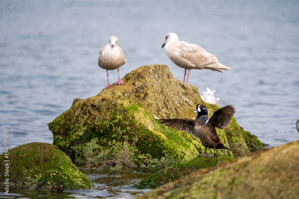 Glaucous Gulls (Larus hyperboreus) and Male Harlequin Duck (Histrionicus histrionicus) resting along the Oregon coast. #1947211007