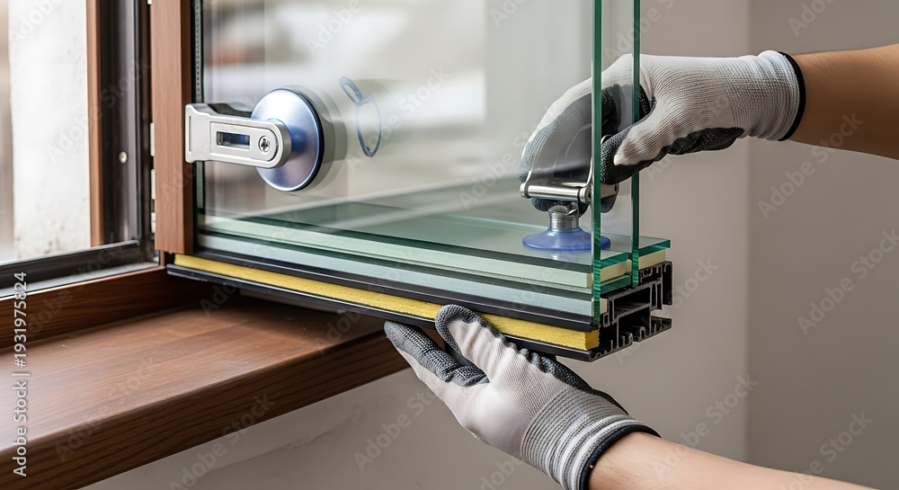 Glazier installing insulated window pane with vacuum lifter indoors #1931975824