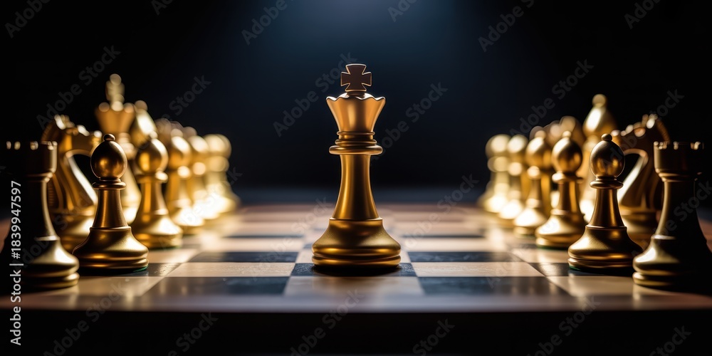Glistening gold chess pieces stand poised on a checkerboard under dramatic illumination #1839947597