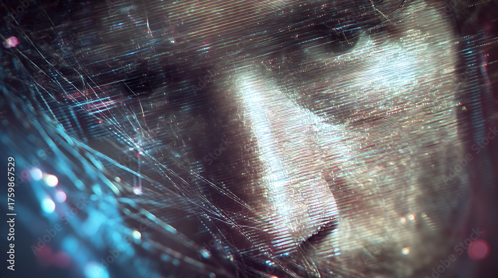 Glitch art portrait of a thinker trapped in a web of glowing fiber optics, overexposed light trails, distorted background of binary code, cyberpunk concept art, #1759867529