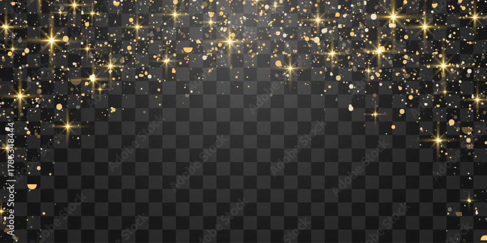 Glitter gold particles shine effect on png background. Vector gold glitter particles effect and texture. Stardust amber particles color on transparent background. Golden explosion of confetti. #1786348444