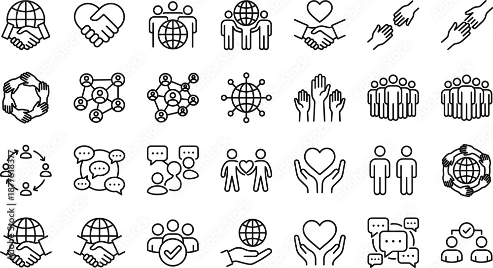 Global community and social connection line icon set featuring teamwork partnership communication support unity collaboration worldwide people networks #1877618377