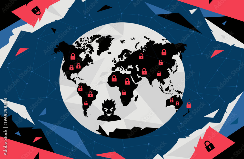 Global cyber threat illustrated by a world map with locked continents and a shadowy hacker figure beneath a digital storm of polygons, signifying worldwide digital insecurity and a pervasive security. #1969298403