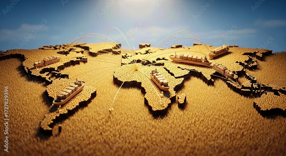 Global grain shipping routes, cargo vessels moving across world map, symbolizing international wheat trade, agricultural commodity logistics, and supply chains, clear blue sky above. #1727829396