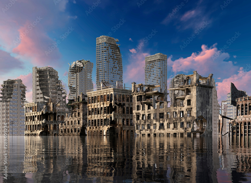 Global Warming Ruins of a city apocalyptic landscape 3d illustration concept #289405234