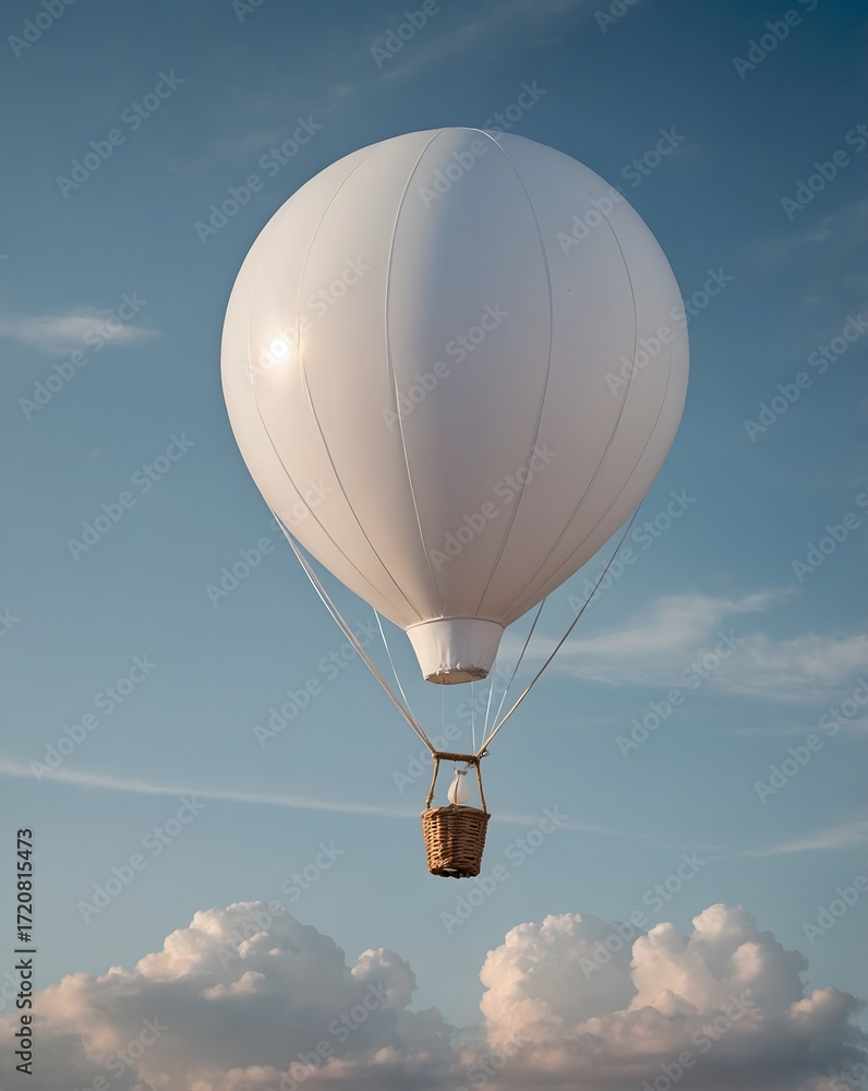 Globo aerostático blanco volando sobre nubes en cielo azul despejado al atardecer #1720815473