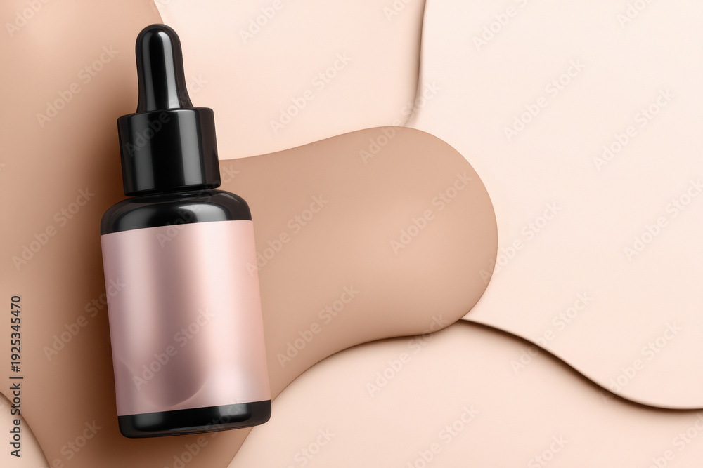Glossy black dropper bottle on abstract background with organic shapes #1925345470