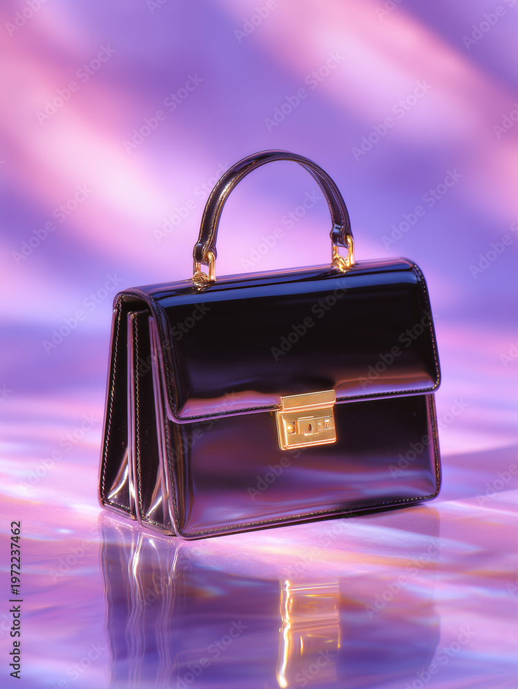 Glossy black leather handbag with gold hardware on pastel lavender reflective surface, 80s luxury accessory close-up #1972237462