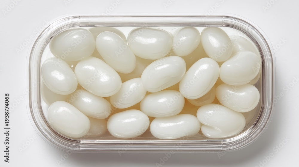 Glossy White Jelly Beans in a Clear Plastic Package Top View #1938774066